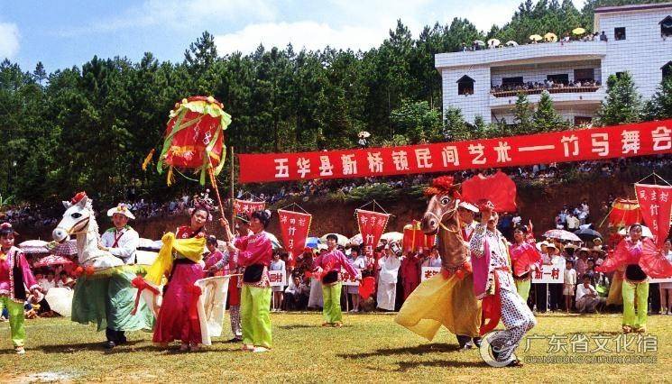 相传竹马舞源自周王伐纣时,姜子牙以旗杆竹制成竹马,以绿竹制成鸡、鸭、鹅、鱼等,并施法化为活物,扮作迎亲队伍,大败纣军,迎回邓婵玉与土行孙成亲的民间传说,明朝末年传入粤东五华县,俗称“打马灯”、“舞竹马”,距今已有近400年历史。主要分布在新桥、华城、潭下等乡镇。尤其新桥一带,传承绵延不息,鼎盛时期曾有演出队22个,遍及村村寨寨。