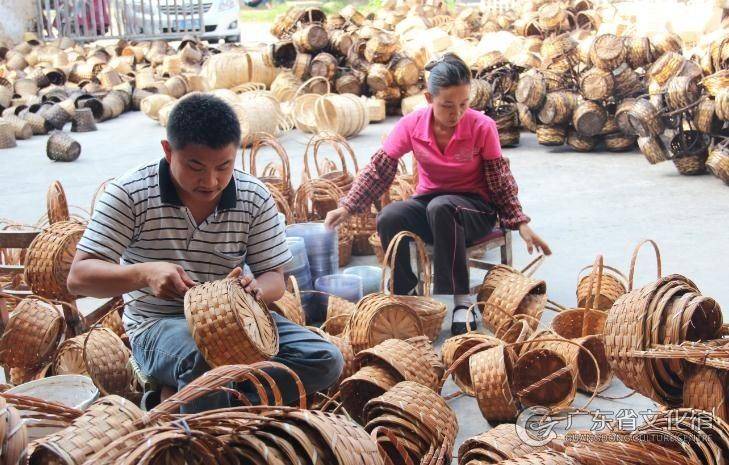 信宜竹编的制作过程可分为竹篾材料加工、编织、后期加工三部分。竹丝篾片加工分为锯竹、修竹、开间、劈篾、劈丝、刮篾、刮丝等7个步骤。信宜竹编编织类型可分为篾片编织和篾丝编织,篾片编织主要制作箱类、盘类等,而篾丝编织主要用于制作篮类。在方法上,分为密编和疏编。密编的编篾(丝)之间彼此紧扣,不留空隙;疏编刚疏朗有致,篾片(丝)之间的空隙较大。编织技法以挑压编为主,挑即编篾(丝)在被编篾之下,压即编篾(丝)在被编篾之上。常见手法有“挑一压一”“挑二压二”“挑三压三”等。后期加工主要包括修剪、去毛刺、装饰、染色、防虫霉等。