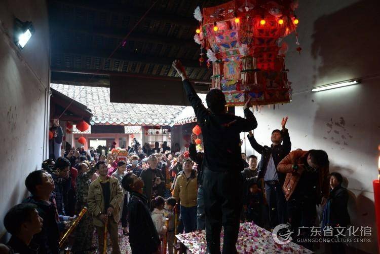上灯之日“上”到大梁去的花灯,一般情况是悬挂到次年的上灯期间,有的地方则是悬挂到正月十六、十七、十八日,举行“暖灯”仪式。各地“暖灯”仪式的具体形式略有不同,通常是新丁户各端出 5 碗佳肴,先敬祖公、祖婆。稍后,由一个长者主持,将花灯取下,一席祝颂后摘下灯上的白花,分别递给新丁户代表,祝来年添丁发财,接着将灯上的“金砖”取下,再扎紧后,依然吊在大梁上,待来年上灯日启用。礼毕,等候在堂的男人们,蜂拥而至“抢灯”,将“抢”来的人物画像、花朵等吉祥物摆放在家里醒目的地方,以示吉祥如意。