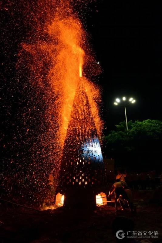 夜晚烧番塔时,村民们边烧边唱“番塔歌”,一群青年围着番塔,不断往塔身抛撒木糠、生盐,负责捣火的村民挥动长竹竿,倾力捣动番塔火膛里的柴火,顿时一团橙红色火焰直冲云霄,足有两三层楼高,场面壮观。烧番塔期间,还有祈愿纳福仪式:30 位男子用他们的双手传递着装有现场信众许下心愿祈福签的纳福箱,豪迈地步向燃烧中的番塔,投入纳福箱,让群众福愿在火焰中升华。群众与四方游客围绕着烧得红红的番塔欢歌载舞,番塔高高的火焰兆丰年,风调雨顺福安康。当晚还会组织舞蹈比赛、粤剧表演等,整个夜晚到处火树银花,盛况空前。